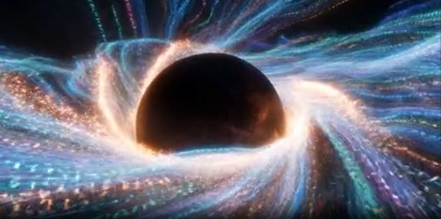 Around this point in the spacetime continuum is the “Event Horizon” - the invisible boundary beyond which no object can travel fast enough to escape the pull towards the singularity. Not even light. Once the event horizon is crossed, everything “flows” down towards the singularity at increasing speed.